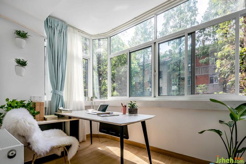 室內(nèi)設(shè)計(jì)師在主臥陽臺(tái)主要改造成王老師的工作區(qū),一張簡易的寫字桌搭配一把金色的貝爾托亞單人椅,整個(gè)空間通透明朗,無論春夏秋冬,無論辦公休憩,這個(gè)空間都是最好的去處,用我最喜歡的一句話,陽光為房間開了燈,更為適合不過了吧。