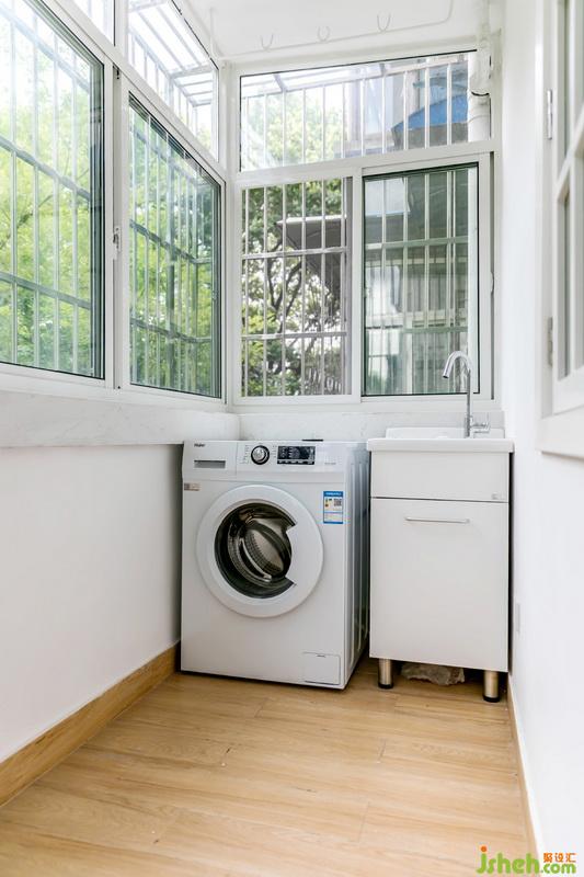 北陽臺(tái)作為生活陽臺(tái),為了留住大面積的窗戶的采光,簡單布置了洗衣機(jī)和成品的洗手臺(tái),能夠收納平常洗衣物所用的洗護(hù)用品。滿足日常使用功能。