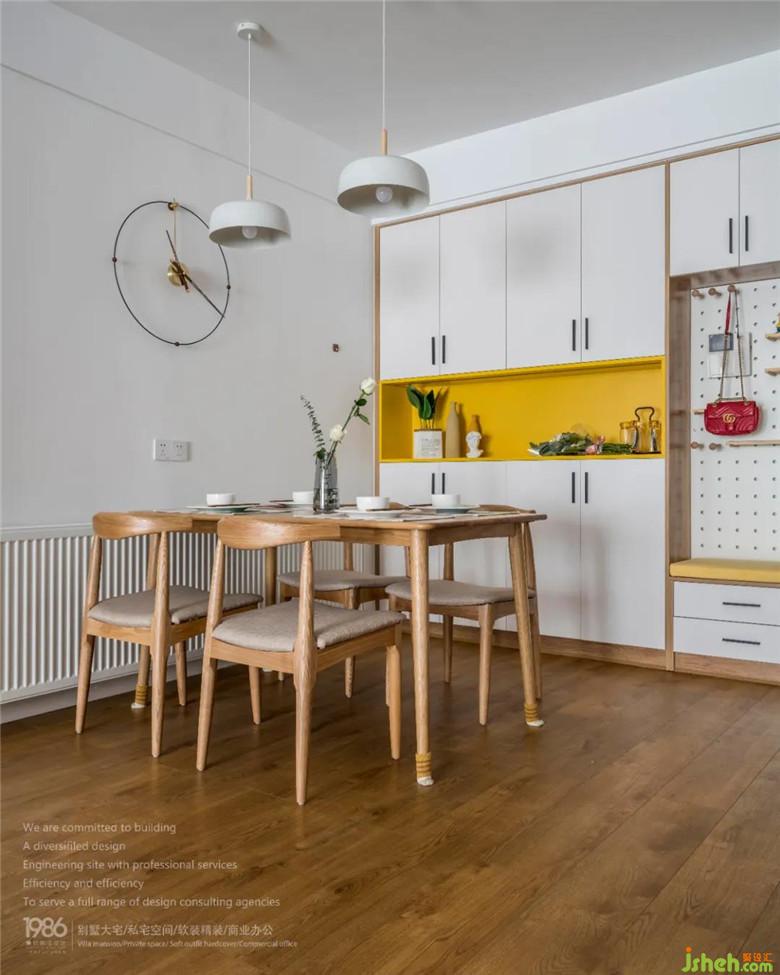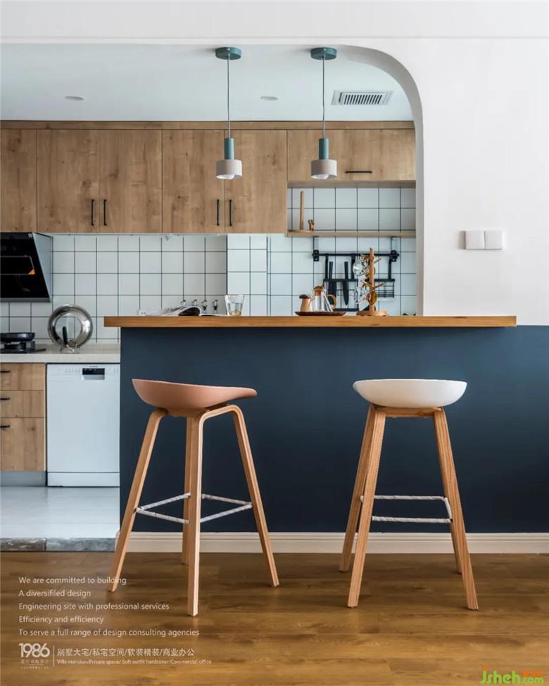 餐廳及廚房的開(kāi)放式設(shè)計(jì),裝修公司結(jié)合原木層板式的吧臺(tái)機(jī)能,滿(mǎn)足了男女主人的燭光晚餐或是與三五好友愜意地把酒言歡。
