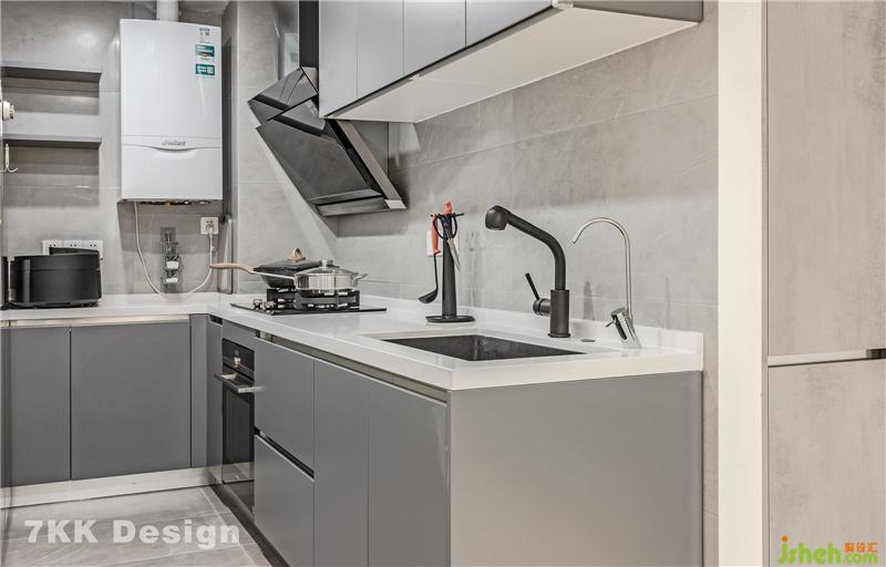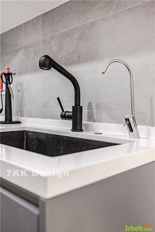 L字造型廚房,操作臺(tái)非常重要根據(jù)需求的高度進(jìn)行設(shè)計(jì),否則會(huì)造成靈活困擾。淺灰色的鋪設(shè)更注重開放性、冷色調(diào)。給人一種清爽的感覺,減少了不必要的裝飾線條,水槽采用石英石的水斗,旁邊的不銹鋼水管可以直接供應(yīng)給客人直飲水??鞠浒丛诹讼旅?,微波爐選用可移動(dòng)式,抽屜式的廚門放置碗具。