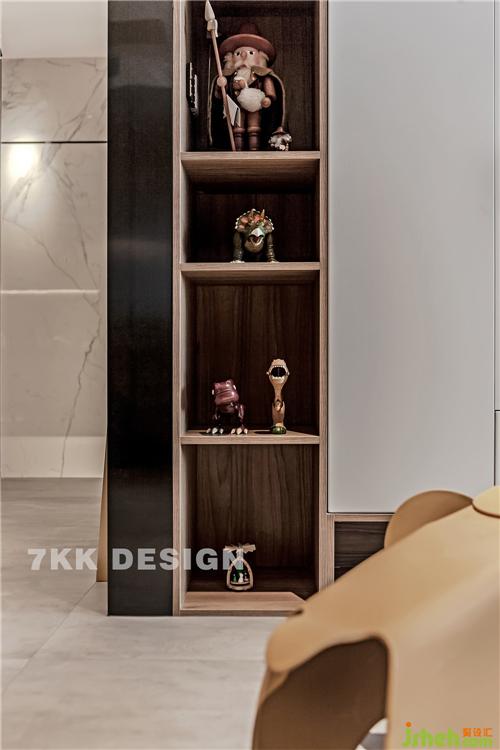 進(jìn)門玄關(guān),原始戶型進(jìn)門玄關(guān)比較狹小,把原始廚房一分為二,外側(cè)做了整體的收納玄關(guān)鞋柜裝飾柜一體,里面做一排一字型廚房操作臺面。玄關(guān)鞋柜鏤空設(shè)計(jì),空間透明,內(nèi)嵌筒燈,增加光線照明,隨手放置進(jìn)出的鑰匙包包物品,很方便。