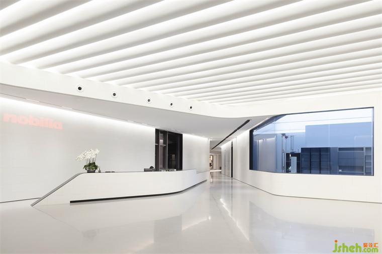 The interior features simple materials, with artificial stone flooring in public areas and carpeting in office and research spaces to facilitate future flexible arrangements. Most vertical surfaces are clad in metal, stone, and glass materials, while the ceilings remain clean and exposed to create height and spatial flexibility. All interior partitions, sliding doors, and built-in cabinets use nobilia and raumplus 's own products. Our idea is that the internal working space of the research center doubles as a " showroom," allowing employees to move among the products they design and produce.
