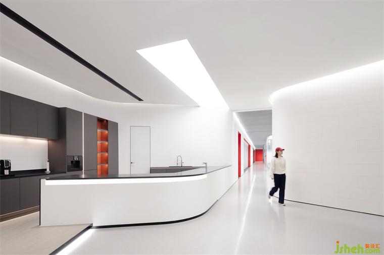室內(nèi)采用簡(jiǎn)潔的材料,公共區(qū)域鋪設(shè)人造石地板,辦公和研發(fā)空間鋪設(shè)地毯,便于未來(lái)靈活布置。大部分垂直表面采用金屬、石材和玻璃材料,天花板保持干凈裸露,以創(chuàng)造高度和空間靈活性。所有的室內(nèi)隔斷、滑動(dòng)門(mén)、嵌入式櫥柜都采用的是柏麗和德祿自己的產(chǎn)品。我們的想法便是,研發(fā)中心的內(nèi)部工作空間同時(shí)也是一個(gè)“現(xiàn)場(chǎng)展示廳”,員工們?cè)谧约涸O(shè)計(jì)和生產(chǎn)的產(chǎn)品間穿梭。