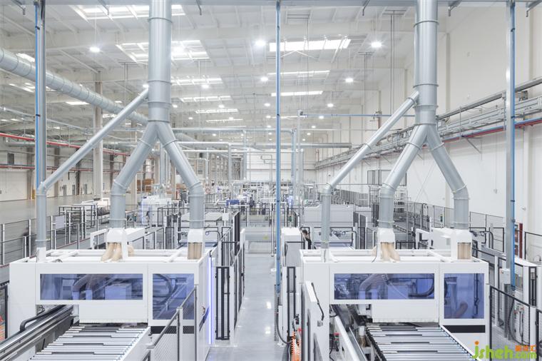 室外材料的色調(diào)延伸到生產(chǎn)廠房的外墻。垂直方向的漸變?yōu)樗襟w量提供了視覺韻律,同時與窗飾設(shè)計相融合。研發(fā)總部設(shè)計廠房內(nèi)部采用大量天窗照明。生產(chǎn)線在幾乎零粉塵的室內(nèi)環(huán)境中運行。景觀設(shè)計基于海綿城市的理念,借助自然雨水的地下滲透。大型水景和起伏的地面景觀打破場地本身的單調(diào)感。建筑南側(cè)種植了大量樹木。隨著時間的推移,這些樹木將逐漸長大,為停車區(qū)提供遮陽,并為研發(fā)中心的主立面提供視覺緩沖。