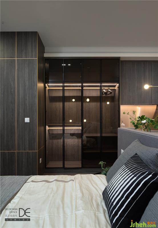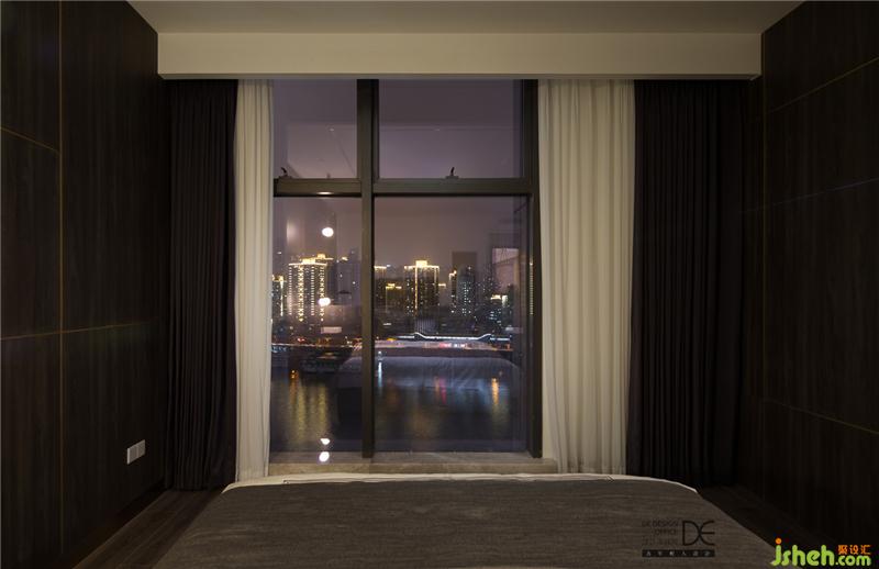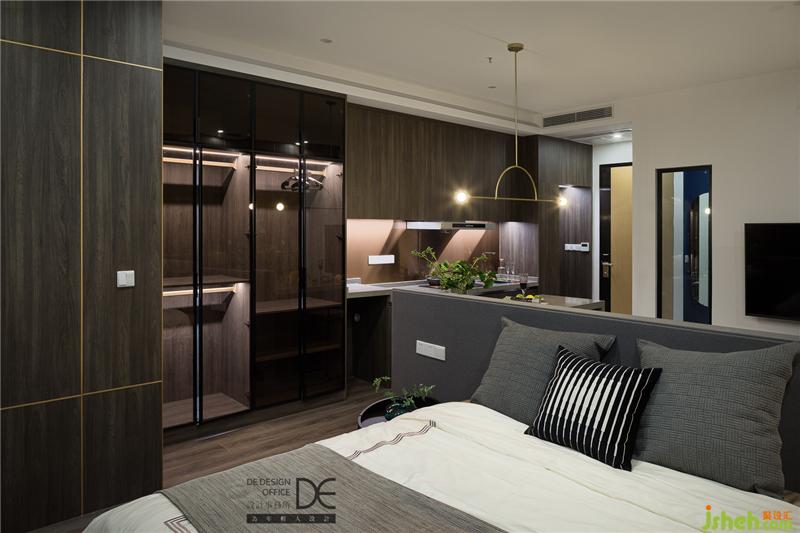 臥房區(qū)域有著極好的視野,晚上可以盡情欣賞窗外的燈火闌珊,早上也可以感受清晨的第一縷陽(yáng)光。連接櫥柜的區(qū)域是一面開放式的衣柜,完全足夠放下夫婦二人暫居的衣物。