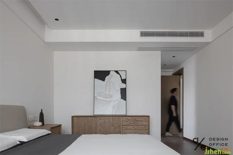 設(shè)計(jì)師希望臥室是干凈純粹的地方,不需要過(guò)多的造型來(lái)體現(xiàn)華麗感,追尋簡(jiǎn)單,通過(guò)燈帶、床頭吊燈、床頭燈來(lái)烘托溫馨氛圍。