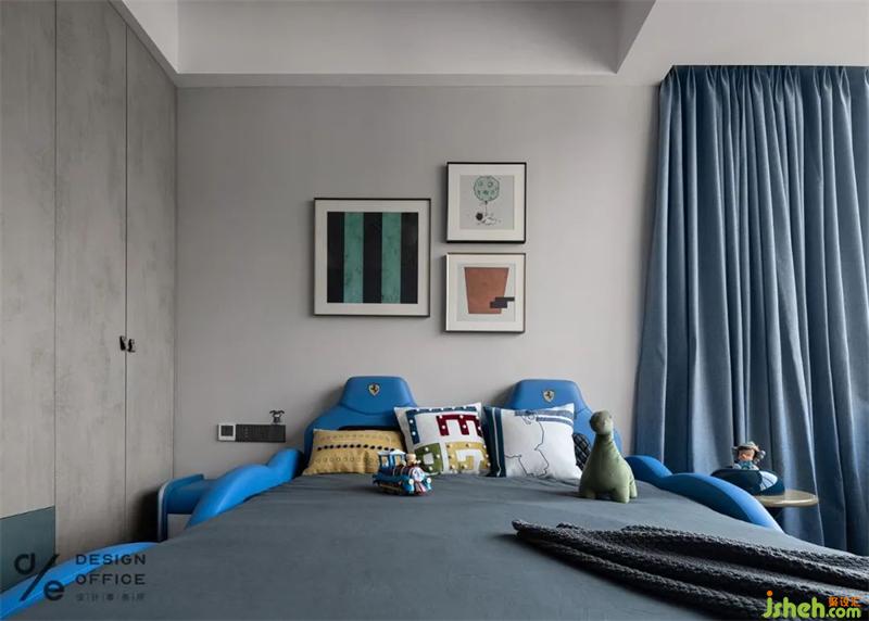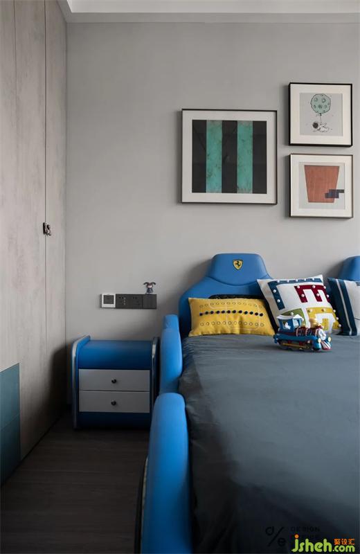 淡灰紋理和藍(lán)色撞色的衣柜,童真有趣的裝飾畫(huà),孩子喜歡的汽車(chē)造型的床,使整個(gè)房間呈現(xiàn)出少年童真感的同時(shí),也不乏硬朗氣。