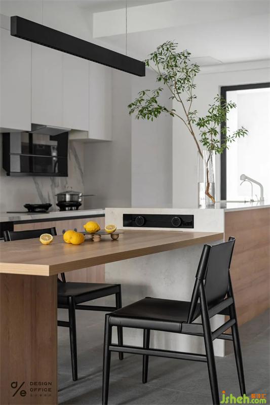 沒有做傳統(tǒng)的封閉式廚房,開放式的廚房增加社交屬性,同時(shí)還保留了獨(dú)立的生活陽臺(tái)。石材上墻,去掉了擋水線等不必要的處理,廚房顯得更干凈、整潔,也更方便清潔。