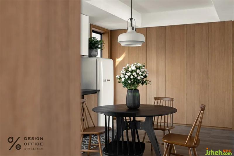 餐廳大量的木質(zhì)元素,吸引著主要通道的目光,聚焦屬于餐桌上的精致美味,餐邊柜上擺上綠植,自然的氣息偷偷融進生活。