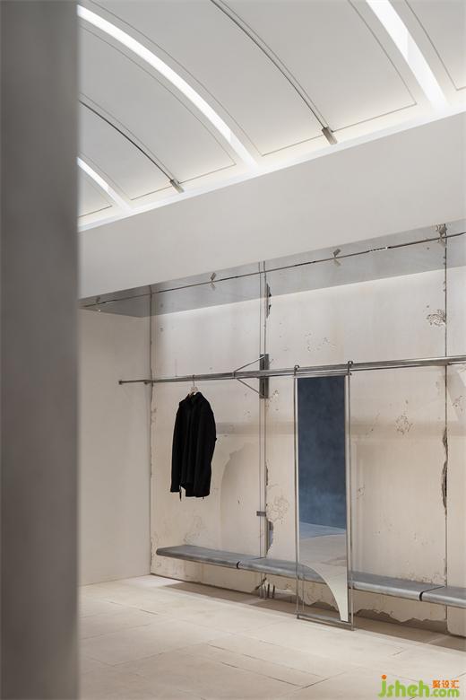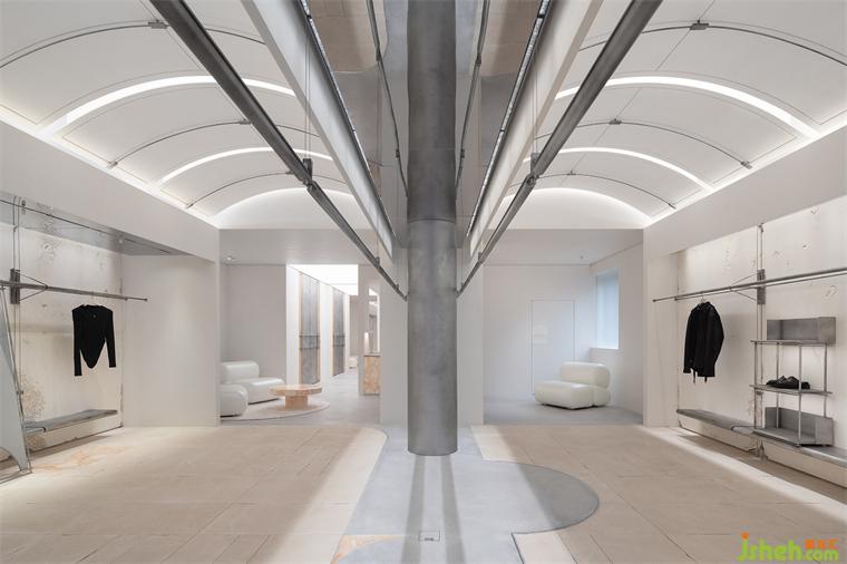 入口的弧形石材門框,是對“裁剪”運動軌跡的提?。婚T把精細穿插的結(jié)構(gòu),展廳設(shè)計是對“縫紉機”穿針引線的表達。細微之處,關(guān)于品牌精神的具象探索,正逐一展開。