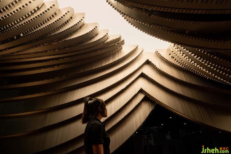 基于這樣的前提,HAS Design and Research建筑事務所提出了一個嶄新的設計,在繁忙且高密度的展會中,創(chuàng)造一處具有自然印象的山谷洞穴。這個泰國鋁石窟文創(chuàng)場不僅重現(xiàn)過去泰國人仰賴自然山水所提供住所與生活場景,更反映當今曼谷人均綠色開放空間僅有6.99平方米,遠低于世界衛(wèi)生組織的9平方米。在日常時段,向上抬升的建筑,制造底層架空的開放空間,一方面創(chuàng)造更多“灰空間”吸引大眾并延伸室內(nèi)外的環(huán)境,另一方面則對傳統(tǒng)泰式吊腳樓多功能“Tai toon”的呼應。到了特殊時刻,有如山谷的天光照亮整個空間,不僅提供教育、學習、論壇等功能,更讓空間產(chǎn)生一股“非日常性”的儀式感,從而賦予身心靈前所未有的感知體驗。