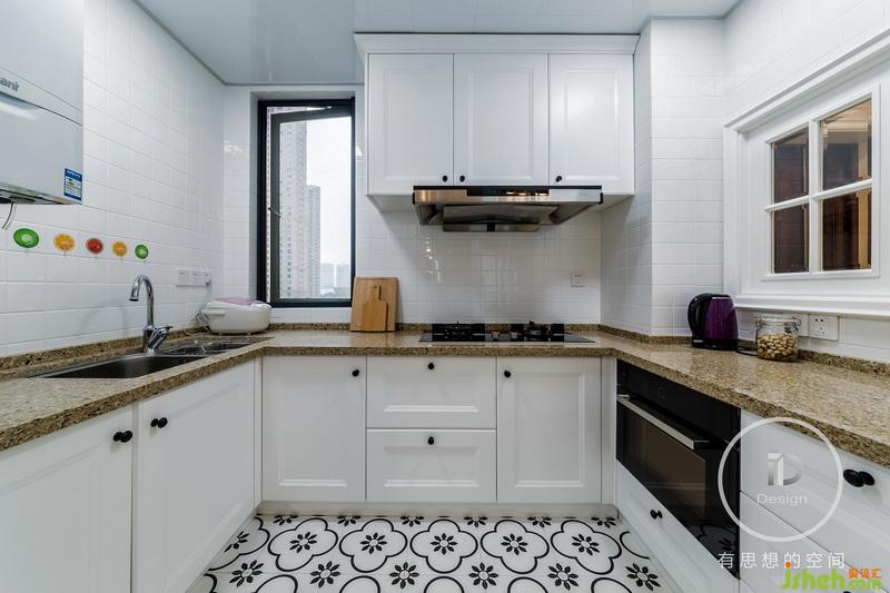 為了考慮廚房的功能使用,室內(nèi)設(shè)計師把冰箱設(shè)計在餐廳,嵌入了烤箱,使整體感簡潔明了。與過道交接處開了一個十字窗,這樣在廚房里也能第一時間知道家人回來了。