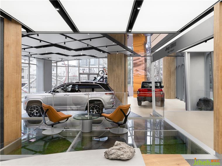 “內(nèi)部建筑”的置入,使得整體門店空間呈現(xiàn)出內(nèi)外互觀的空間視覺關系。Jeep探享中心設計場景化的空間設計使得一切功能的置入更加流暢。空間中出現(xiàn)的座椅不再呈現(xiàn)一種“洽談區(qū)”的姿態(tài),而是露臺上休憩小坐的地方。同時,空間屬性的變化也改變著銷售與顧客的交談氛圍。
