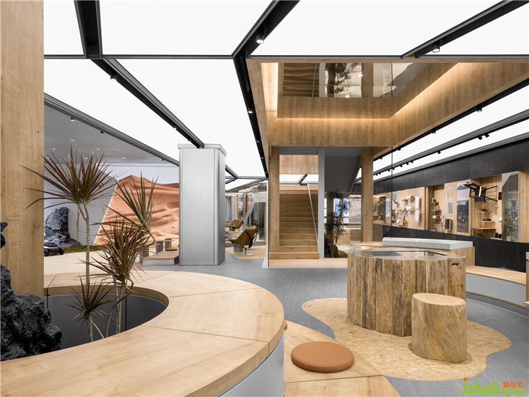 在環(huán)島展示臺(tái)后面設(shè)有通往空間二層的樓梯,樓梯下方空間形成了對(duì)自然外部的櫥窗化展示,地面的土壤、苔蘚和植物,與空間中人造的質(zhì)感形成了反差。透明玻璃幕墻使視線更通達(dá)的同時(shí),也和一側(cè)的框景有著材質(zhì)上的呼應(yīng)。