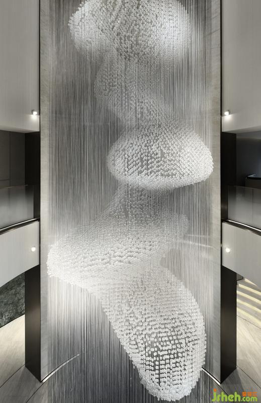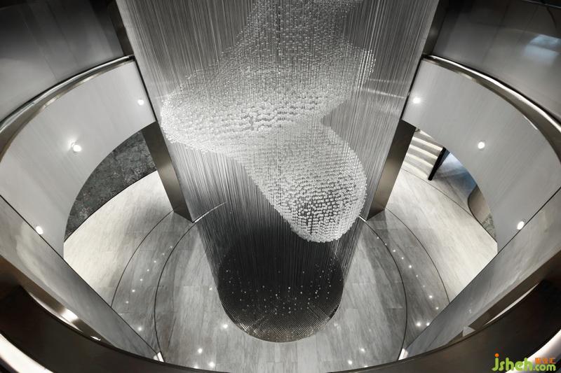 垂感十足的細密晶體似無數(shù)顆流星至天頂串起,直線流墜入中央展示區(qū)域,映照滿堂的光輝燦爛, 如天邊星輝云系,劃過地界之邊。