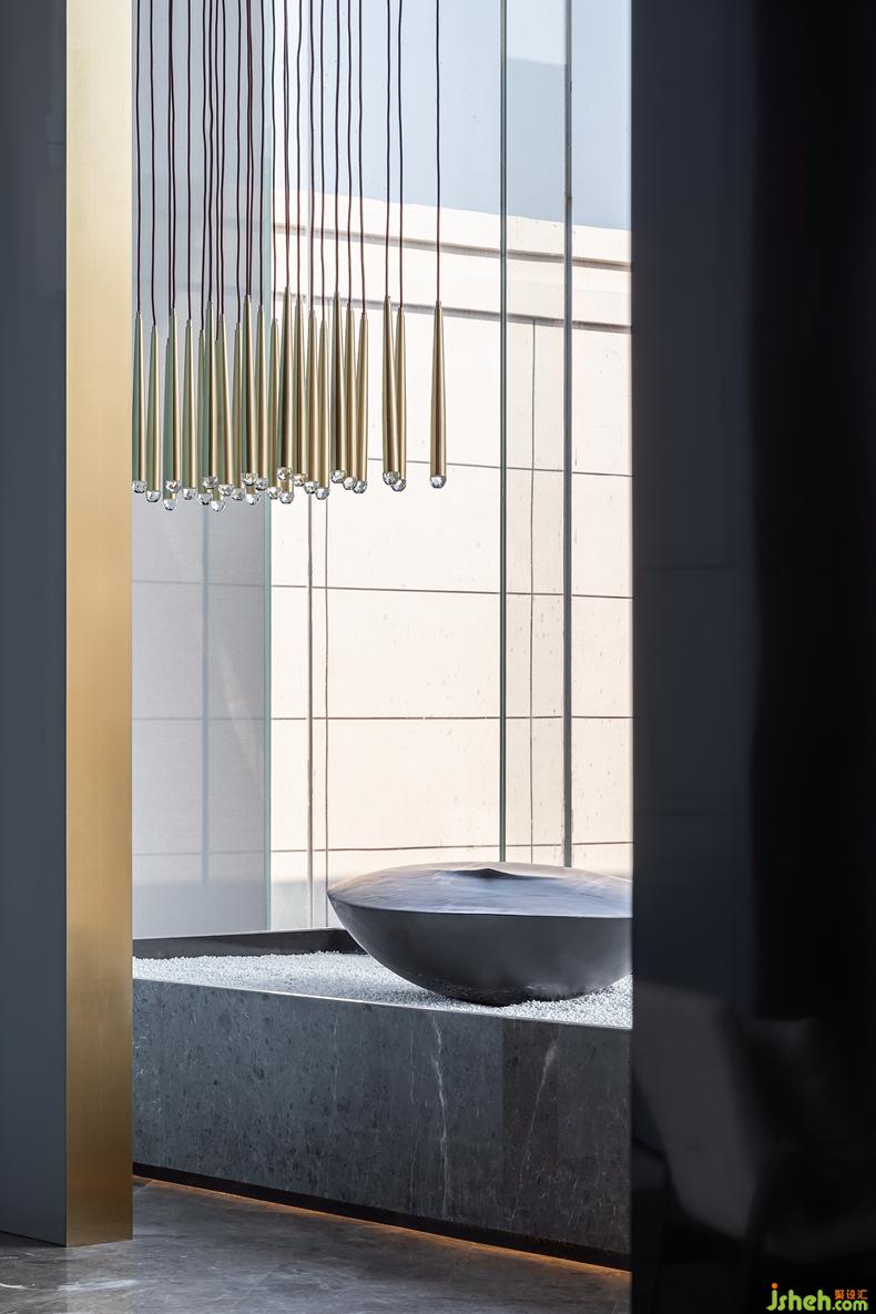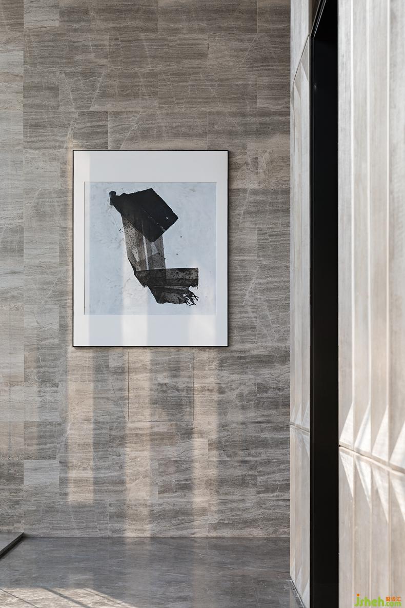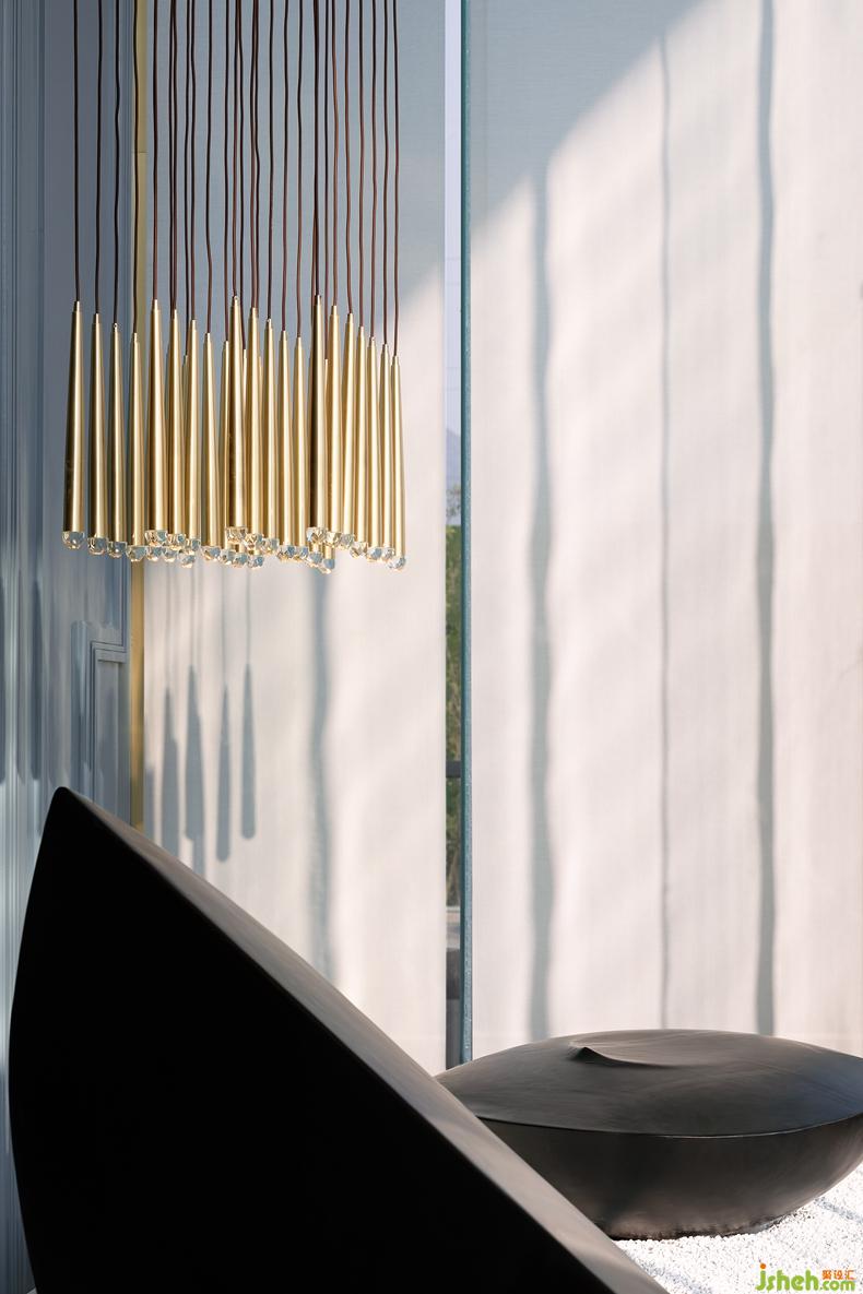 首先映入眼簾的是前廳的黑白攝影畫與Armen Agop的石雕藝術(shù)品兩兩對望,遙相呼應的黑色重彩,輕巧的點綴了整個極簡幾何秩序下的視覺重心。設計公司搭配光影流動,宛如是望向未來的深邃與恒久。