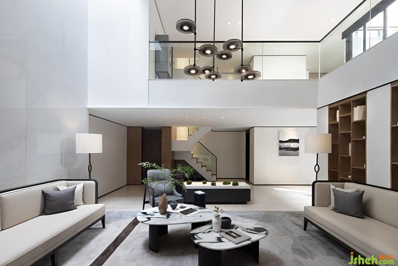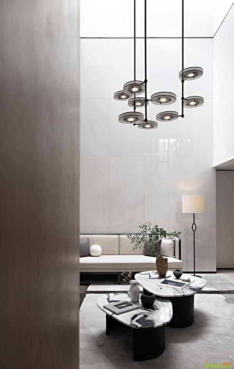 中部挑空的層高為負二層的會客廳帶來無垠的視覺觀感,一側開辟的天窗納入晴光與月色,空間明媚而清麗。