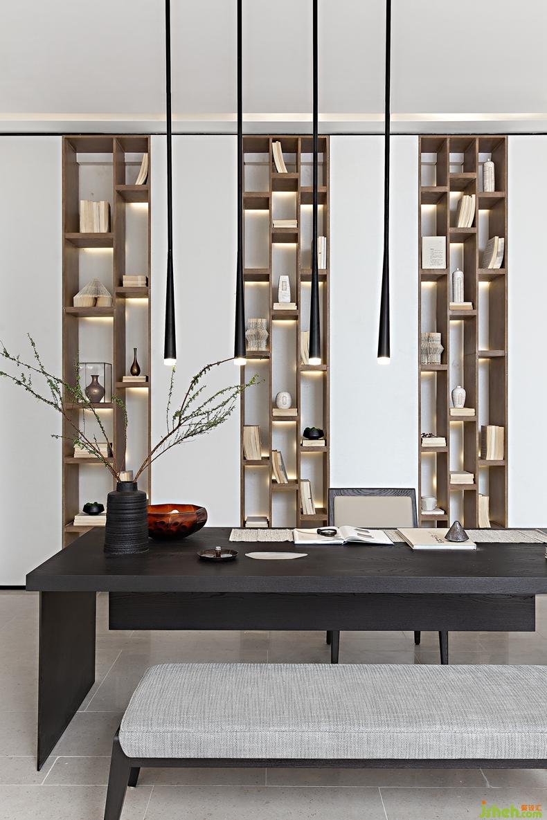 兼容宋代美學與現(xiàn)代主義的極簡法則,鑒寶臺的設(shè)計以墨色與灰調(diào)、木色與素白描繪空間。內(nèi)嵌入墻的木制書架上隨意地陳列著陶瓷器具與舊書,與素凈的雪柳、清透的碧石,共同勾勒出清雅恬淡的文人精神世界,豐盈而綿長。