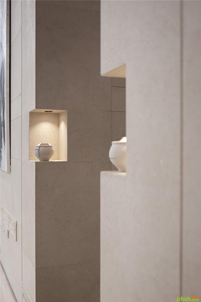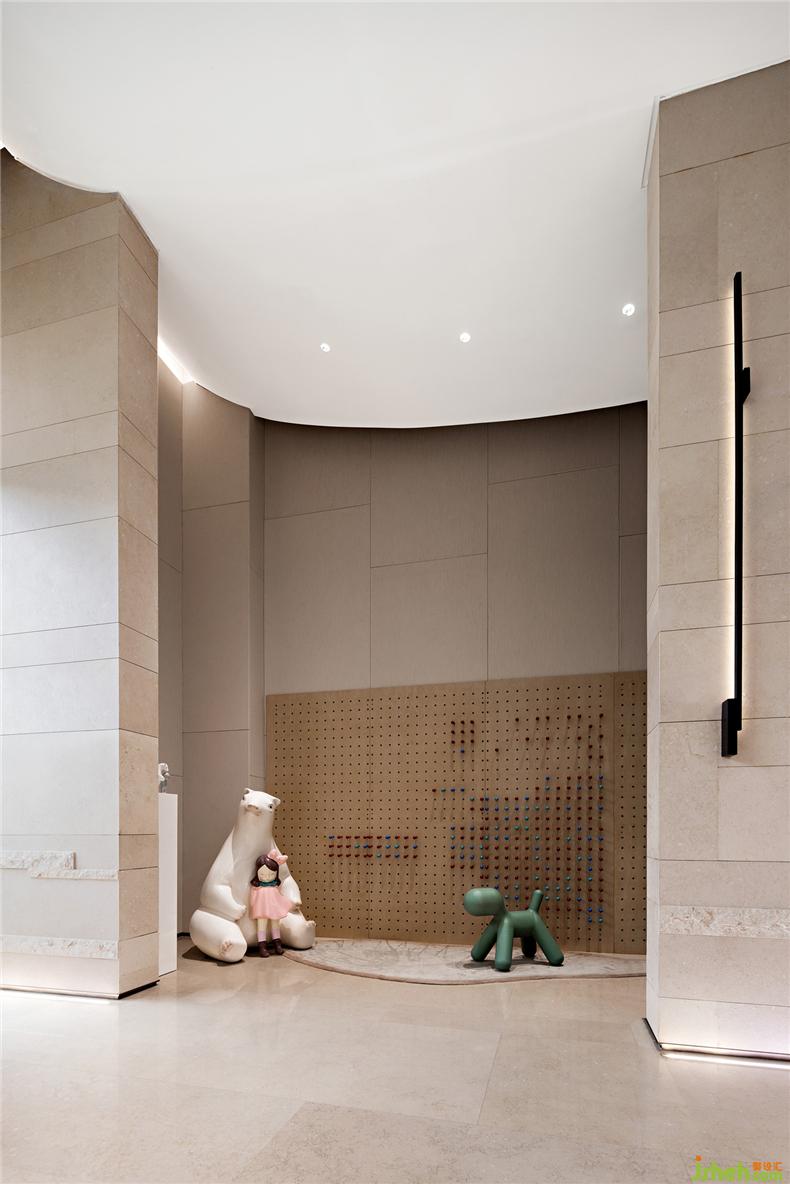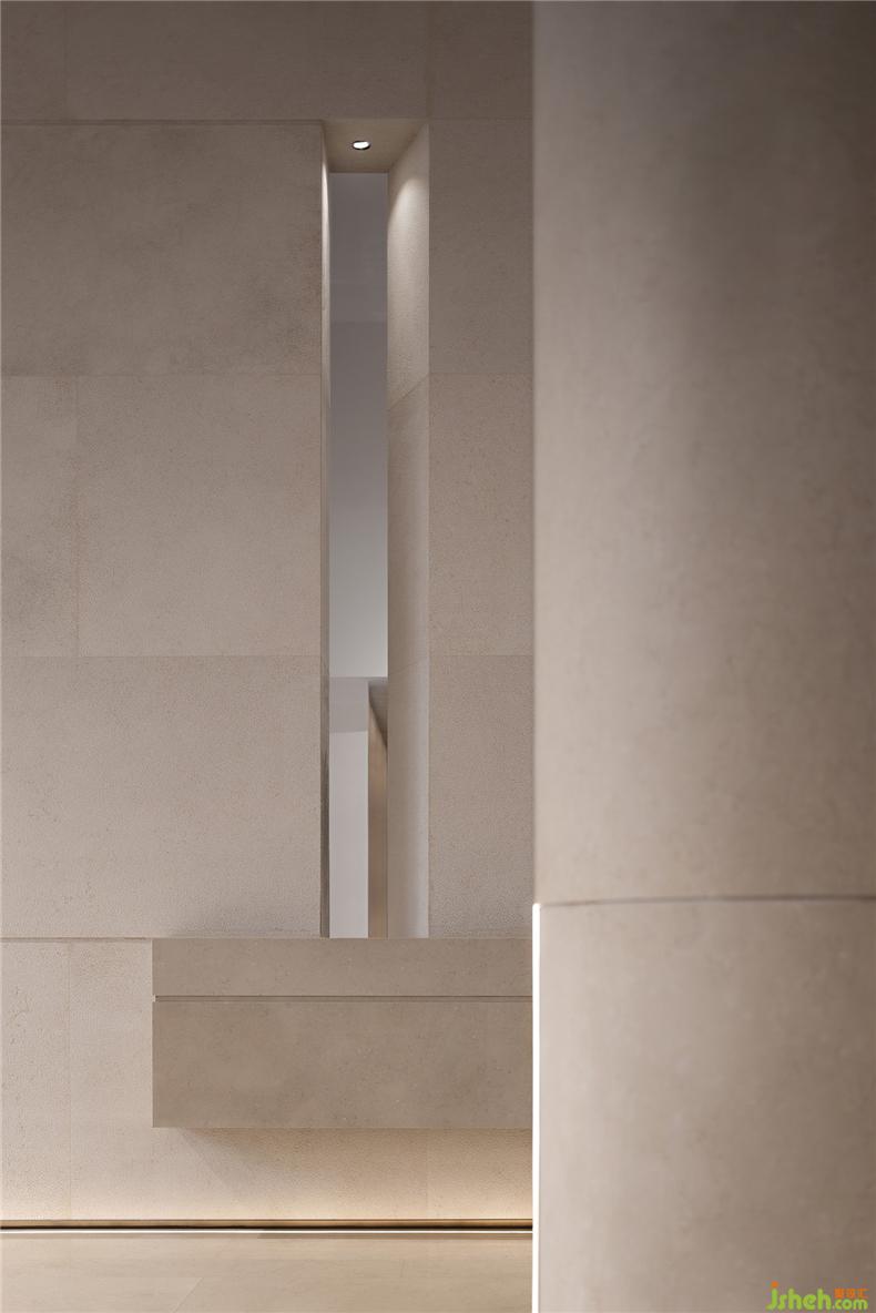 形式的混合通過限制使用材料和顏色來平衡。石材由溫暖的瑞士米黃斧鑿面和瑞士米黃大理石組成,售樓處裝修設計將整個空間中使用的中性色系聯(lián)在一起。該空間中賦予的其他顏色使所陳列物更具光彩