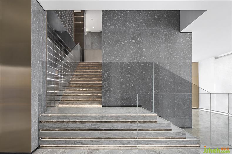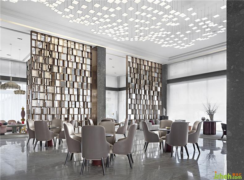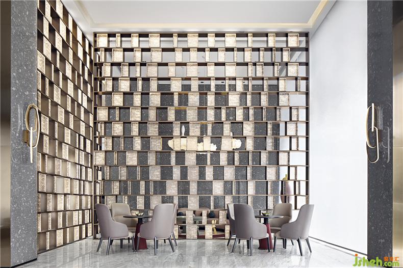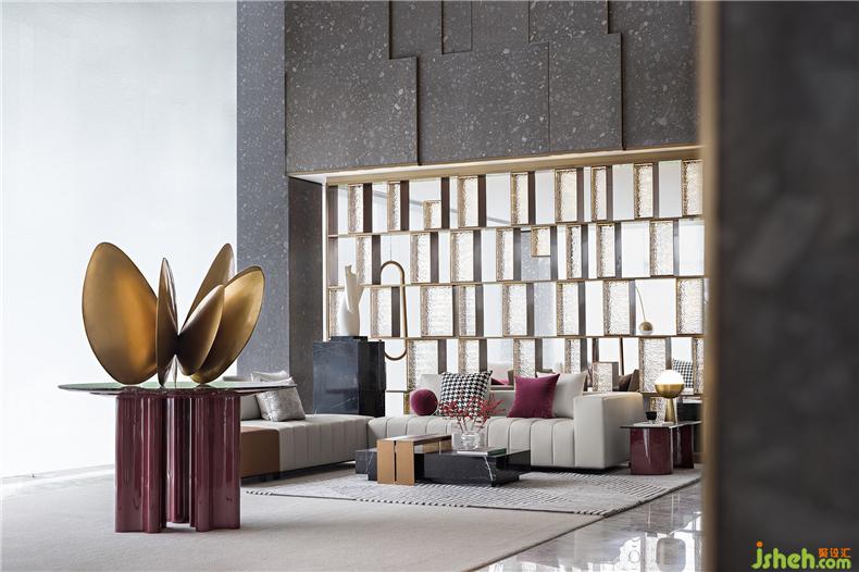 絨紅、灰白、雅棕是深談區(qū)的主色調(diào),金屬屏風(fēng)使得空間間隔卻未斷,室內(nèi)設(shè)計師柔和的光線折射其中,熠熠生動,清雅透亮。形制的簡潔,材質(zhì)的純粹,流麗與典雅滲透在洽談空間的每一處。