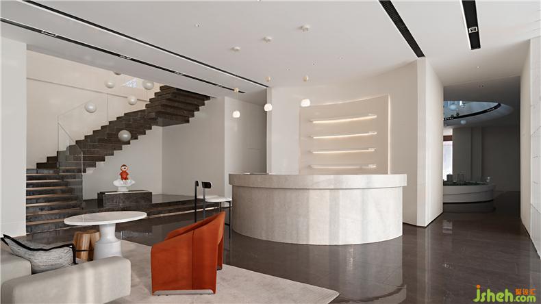 越過門廳,高挑空再一次成為空間中心,極富科技感的金色、黑色玻璃球燈飾,穿越兩層空間從金色不銹鋼穹頂垂吊而下,成為灰白色的空間底色中最為獨特與亮眼的存在,同時,作為一個半獨立式的主要展示空間,在這里,我們開辟了兩條用于空間分流的不同路 徑,同層的兩個雙向入口連通了內(nèi)部的洽談區(qū),而藝術(shù)步梯則通往二層藝術(shù)過廊的閱讀等候區(qū),裝修設(shè)計二層空間中,我們圍繞中空的圓形沙盤,設(shè)置了一個圍合式的藝術(shù)過廊,光潔的白色營造出通透的空間氛圍。跳躍的唐茶色則為空間注入了活力,在這里,書籍、音樂、裝置,共同開啟了空間“與時間相遇”的主題。人們在專屬的寧靜氛圍中感受藝術(shù)的熏陶。