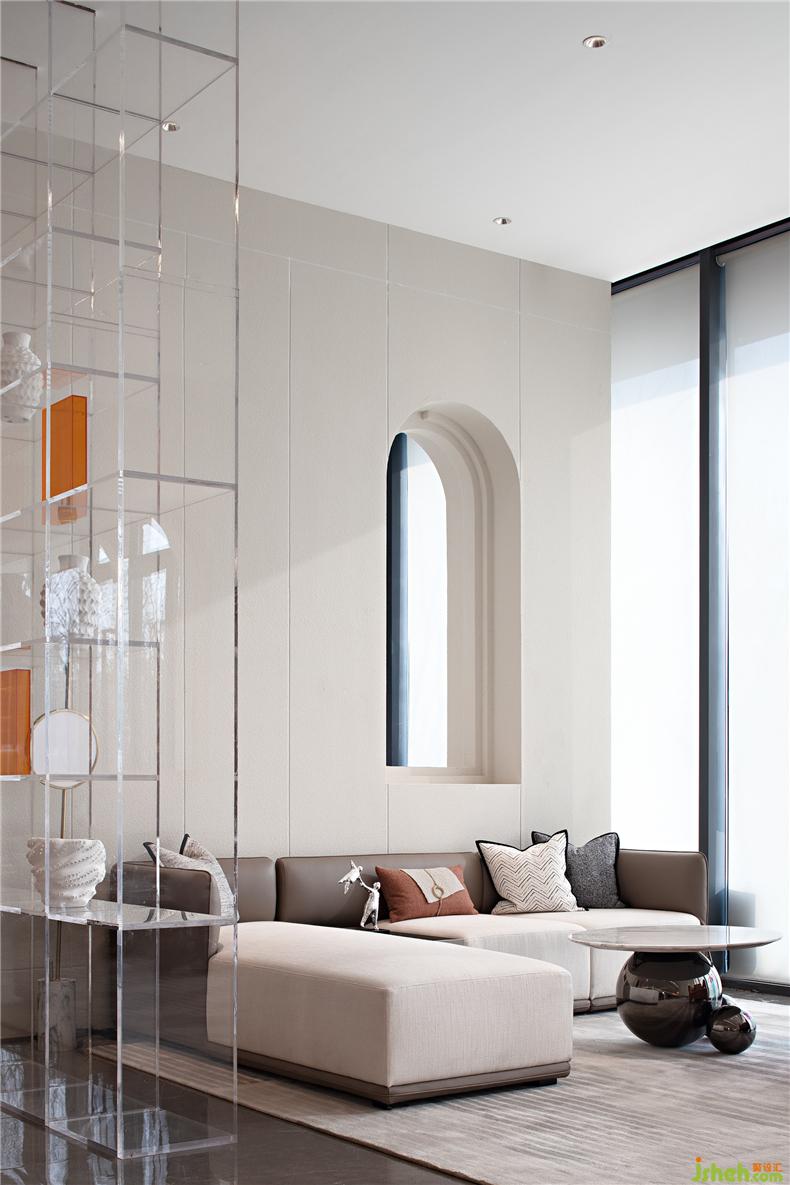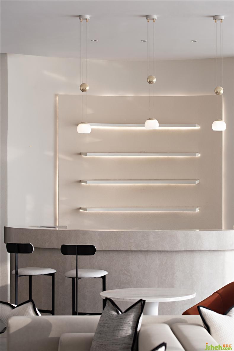 水吧區(qū)、淺談區(qū)與書吧區(qū)三處流線貫通,并在前后兩個區(qū)域成拱形狀圍合空間,水吧區(qū)色彩豐富,玻璃與金屬材質(zhì)的器皿相結(jié)合,用簡約的時尚感打造,符合當(dāng)下年輕人的精致生活方式與追求,淺談區(qū)空間延續(xù)了簡練的幾何線條特征,以及素雅而簡潔的色彩關(guān)系,并利用色調(diào)的深淺對比,和不同材質(zhì)所帶來的細(xì)膩感受來豐富空間的視覺層次,中部低矮的白色布藝沙發(fā)將空間的重心放低,營造出了適宜洽談的舒適氛圍,在午后陽光的映襯下,顯露出低調(diào)而雅致的品質(zhì)之感。