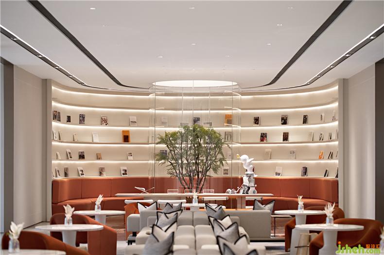 同時,亞克力與金屬結(jié)合的通高透明書架,使各個空間在隔而不離的同時,裝修設(shè)計營造了深度洽談區(qū)所需的安靜氛圍,書吧區(qū)是空間主題——“時光圖書館”,最為精華的所在,超大環(huán)型閱讀書架,以及各類不同的書刊,在尺寸不一的格架中向讀者呈現(xiàn),中間植物裝置將外界的自然引入室內(nèi),橙色軟體卡座沙發(fā)的代表“生機(jī)”與裝置呼應(yīng),富有儀式感的長方形閱讀活動桌,以及當(dāng)下主藝術(shù)作品,共同呈現(xiàn)了一處沉浸式的藝術(shù)閱讀區(qū)域。
