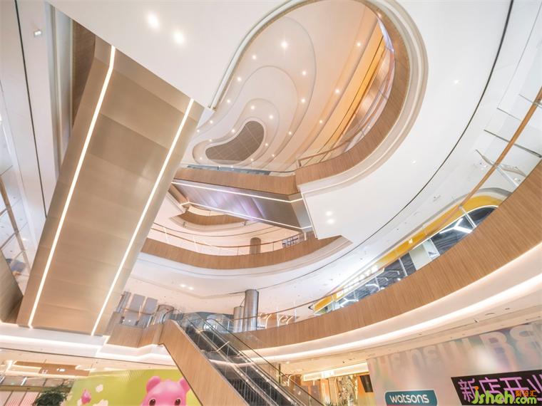 城市展廳以層疊漸退的形式,購物廣場(chǎng)設(shè)計(jì)將原有硬朗直線條調(diào)整為有一定弧度的方式,配合線型燈條的穿插增加柔美輕巧的流動(dòng)感。