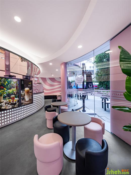 咖啡廳設計室內(nèi)圍繞弧形玻璃墻面放置的主題粉色玻璃鋼座椅和單體小圓凳,室外主題粉色網(wǎng)紅椅和深色網(wǎng)紅椅,搭配遮陽傘,使商業(yè)街游人能夠得到小憩空間,保證空間整體的連續(xù)性,巧妙的為顧客帶來一個既靈動又功能豐富的咖啡體驗場所。