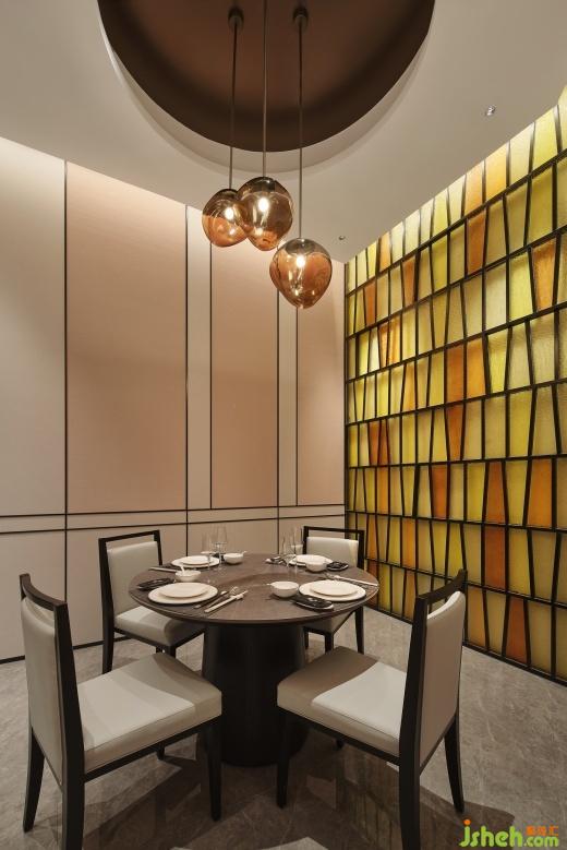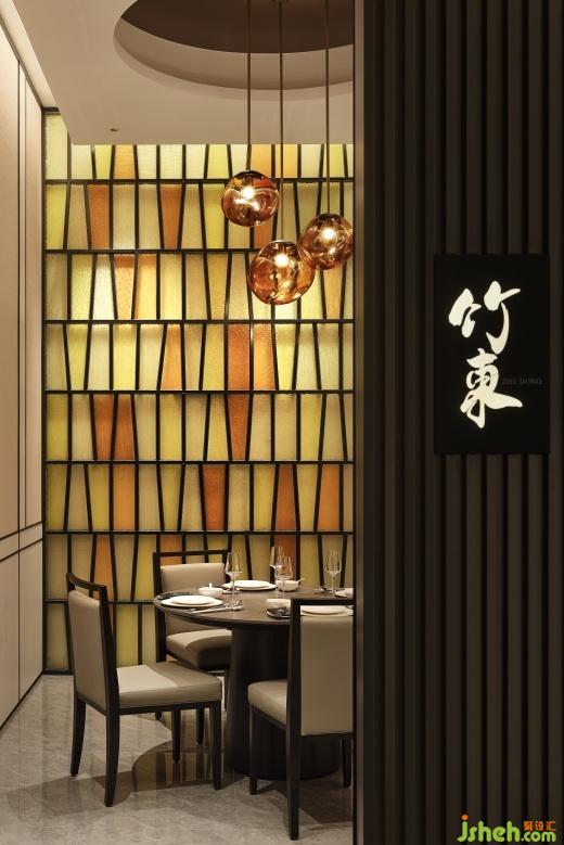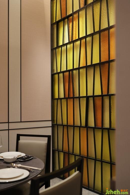 借鑒竹東的玻璃工業(yè)藝術(shù)發(fā)展特點(diǎn),餐廳設(shè)計(jì)運(yùn)用黃色系多色混搭窯燒玻璃作主背景墻,天花中部垂吊水紋燈表現(xiàn)玻璃折射燃燒的光影,仿佛竹東玻璃的整個(gè)制作過程呈現(xiàn)在眼前。