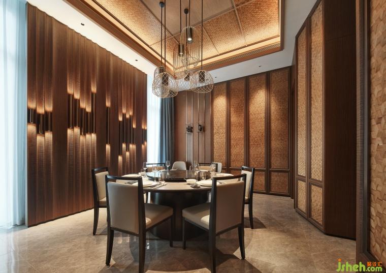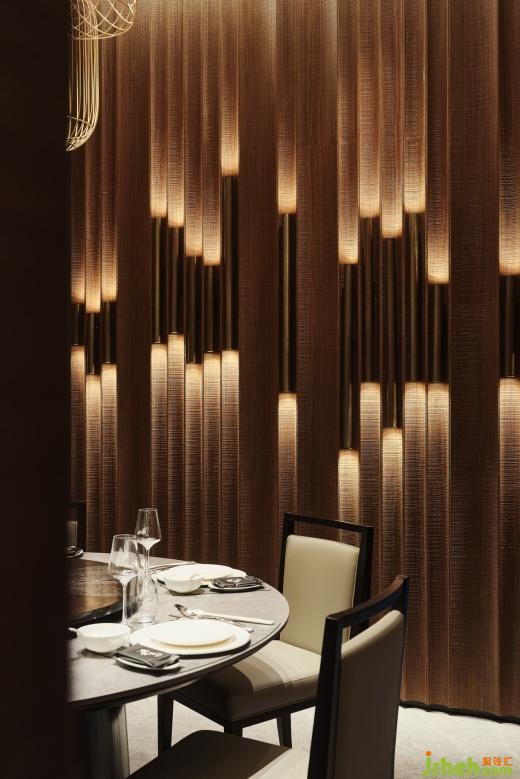 餐廳設(shè)計(jì)墻面巧妙融合了藤編與木雕技藝,配以仿藤編金屬網(wǎng)裝飾內(nèi)置木雕藝術(shù)作品,既彰顯了客莊鐵道文化與木雕藝術(shù)的獨(dú)特魅力,又凸顯了客家人宴客時(shí)的精致與考究。