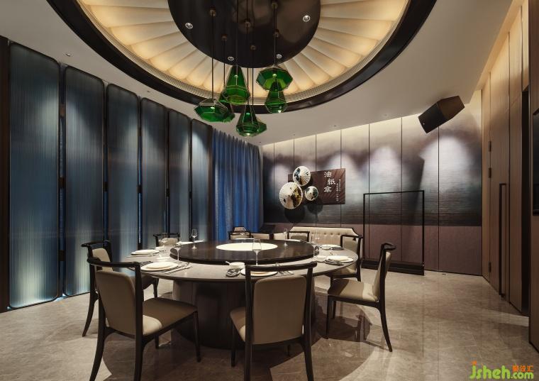 空間設(shè)計(jì)以油紙傘獨(dú)特的文化內(nèi)涵裝飾,傳遞吉祥、平安和團(tuán)圓的美好寓意,山林意象的壁布環(huán)繞空間,如置身于美濃寧?kù)o美好的自然風(fēng)光之中。圓形天花吊頂巧妙地采用了透光材質(zhì)的組合,營(yíng)造出傘面撐開(kāi)的視覺(jué)效果,在燈光下展現(xiàn)出溫潤(rùn)輕盈的光影效果。