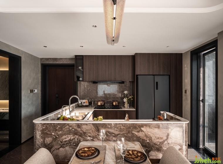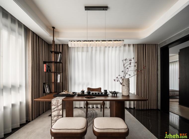 大地色自然風格作為疊翠的標志性設計,深淺格調與木質、金屬、石材等元素的運用,最終營造了整體沉穩(wěn)的暖意和靜雅的氣質,不浮于表面,刻寫在客廳空間場景的生動細節(jié)之中.