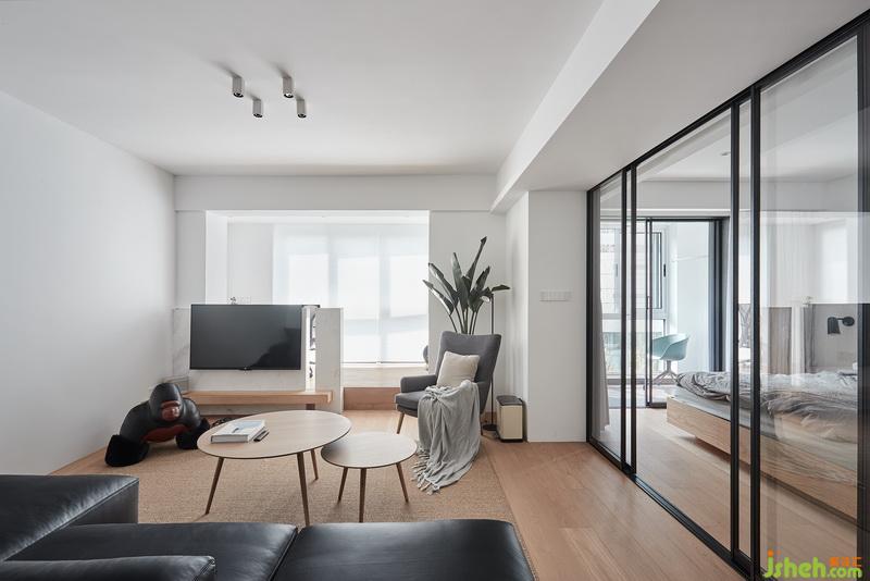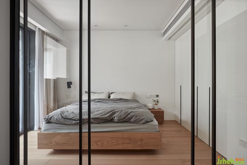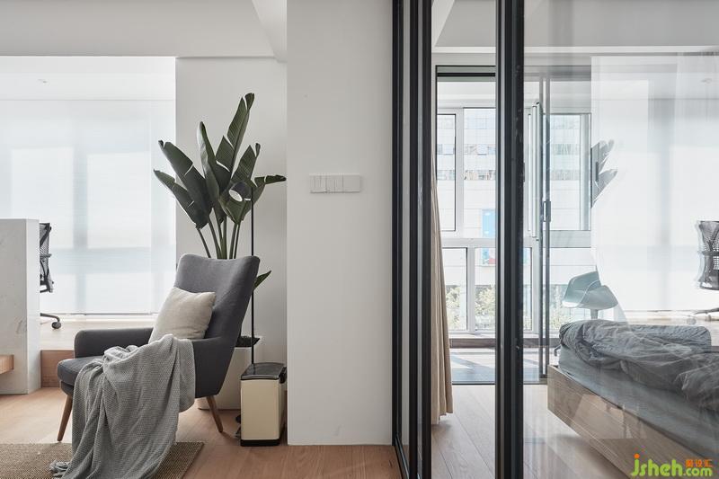 這是位于杭州城西的一所小戶型住宅。室內(nèi)設(shè)計(jì)師在與業(yè)主溝通后,了解到業(yè)主對(duì)于生活的理解正好與“Less is more”相一致,于是我們在滿足業(yè)主對(duì)于房屋的基本需求后,我們開始做減法,主臥與客餐廳區(qū)域室內(nèi)設(shè)計(jì)師利用玻璃移門形成通透的空間,相互貫穿,將空間模糊化,從而在視野上削弱了小戶型帶來的局促感。