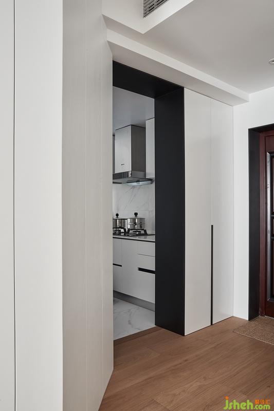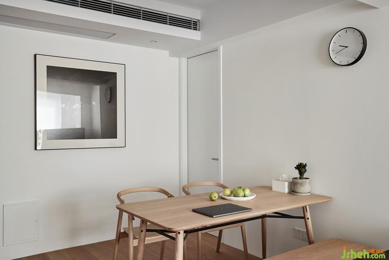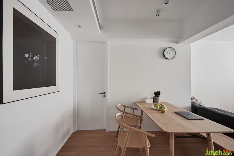 空間留白是極簡設計中最常用的手法。此住宅墻面大面積留白,室內(nèi)設計師為了讓墻面顏色和地面顏色搭配更融合,舍棄了踢腳線,這樣整個空間看起來更為流暢。