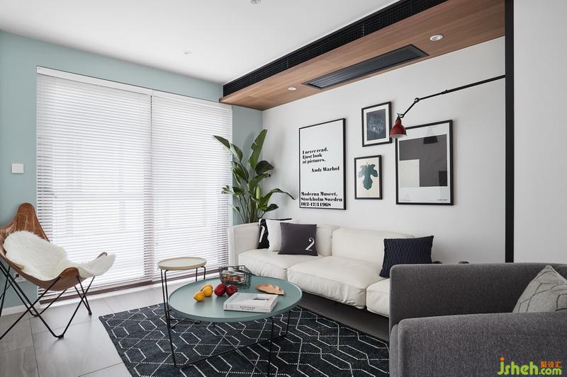 小兩口收養(yǎng)了一只流浪狗,寵物狗會在窗簾上撒尿,而且常規(guī)落地窗簾也會比較占空間,客廳對遮光性和私密性要求都不是很高,所以室內(nèi)設(shè)計師用了風格相對于不占空間,易于打理的百葉。 因為沒有安裝常規(guī)窗簾,所以通過墻面色彩不一 ,但是和家具軟裝呼應(yīng)讓空間更加有層次感