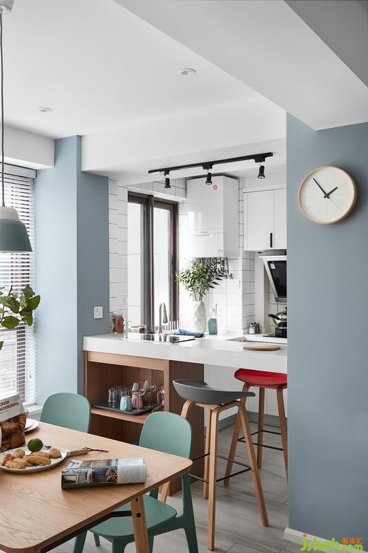 小兩口不太做飯。平時工作也比較忙,但是非常熱愛火鍋,于是有了吧臺的設(shè)計,上面增加了電磁爐。效果上來說小戶型做開放式廚房也能極大提升空間感,弱化尺寸上帶來的局限性。