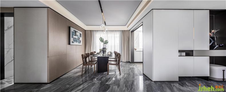 開(kāi)放式式餐廳與廚房的巧妙連接,讓空間變得更靈動(dòng)。樣板房設(shè)計(jì)大理石材質(zhì)的餐桌帶來(lái)的質(zhì)感與皮質(zhì)餐椅,形成一剛一柔的對(duì)比與碰撞
