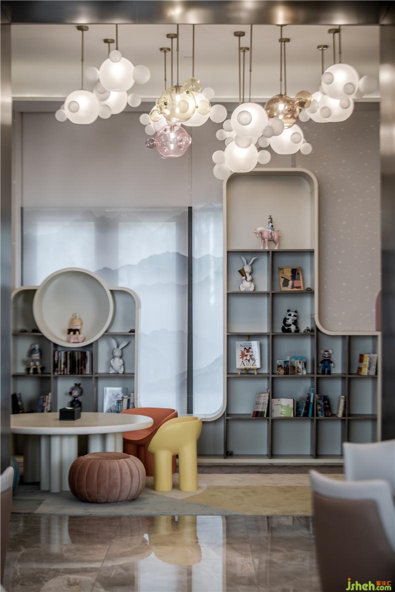 弧形是守護(hù)孩子最好的詮釋,在保護(hù)孩子安全的同時(shí),裝修設(shè)計(jì)利用弧線的張力誘發(fā)想象力。懸飄在半空的球體燈,結(jié)合圓弧型的天花,成為視覺焦點(diǎn),俯仰之間,仿佛陷入蹁躚云上仙境的空間感受