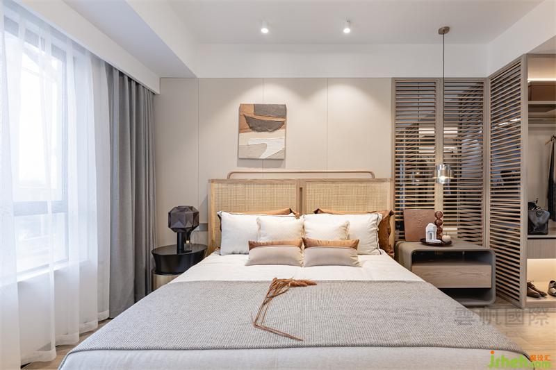 臥室用色雅致,木材與皮革和金屬分格線構(gòu)成床背景,有效提升臥室品質(zhì)和溫暖氛圍。深淺有別、疏密有序的壁布硬包,則凸顯細(xì)節(jié)質(zhì)感。衣帽間半開放式收納形式,更能體現(xiàn)衣帽間的展示性和實(shí)用功能。