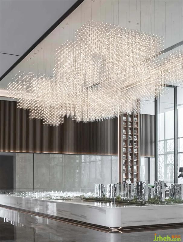 金屬線條穿插、交疊,形成立體的網(wǎng)格狀吊燈,將數(shù)學(xué)的理性嚴(yán)謹(jǐn)美具象化。遠(yuǎn)看云霧般的鏤空設(shè)計(jì)將視覺(jué)引向更遠(yuǎn)方,呈現(xiàn)出“山色入城秋”的美感,也暗承西安古城的歷史文化淵源。