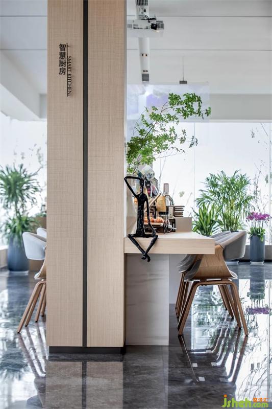 智慧廚房置于明亮之中,自然木色和黑色藝術(shù)品頗具雅趣。植物的加入,生氣了整個(gè)空間,禮貌而不過(guò)分熱絡(luò)的與來(lái)訪者產(chǎn)生舒服的聯(lián)系。