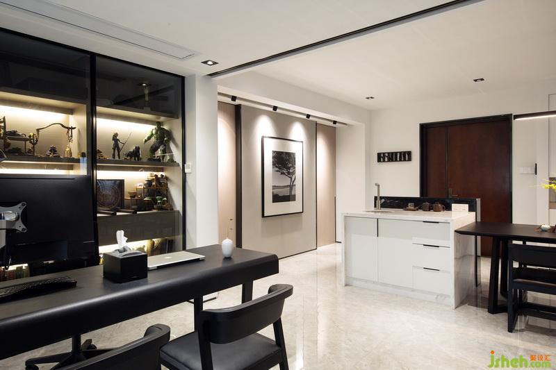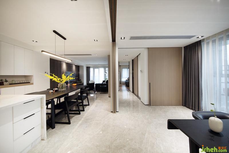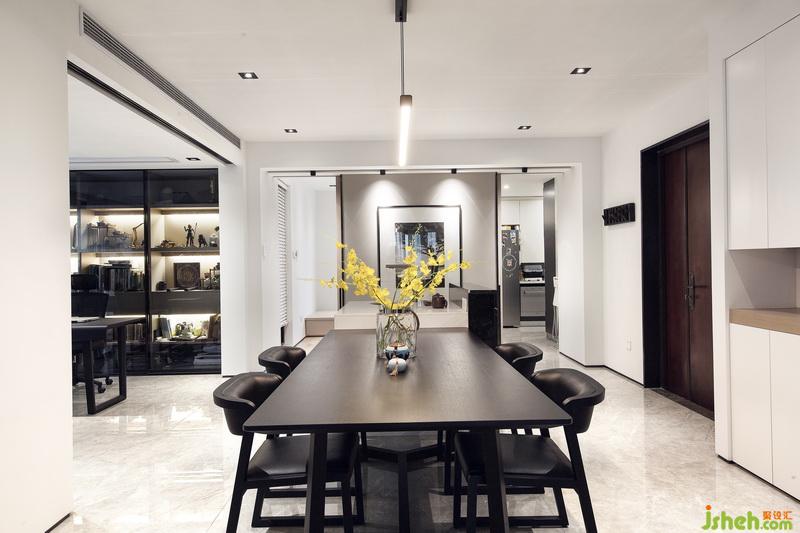 經(jīng)過室內(nèi)設(shè)計師的巧妙規(guī)劃,原本客廳和書房的位置對調(diào),使客廳餐廳在同一動線上,利用移門這種班隔斷的形式,將書房和客餐廳公共區(qū)域進(jìn)行有效的劃分,空間避免了使用過多的元素造成的雜亂感,在材質(zhì)和顏色的選擇上比較整體同一,簡潔大氣。