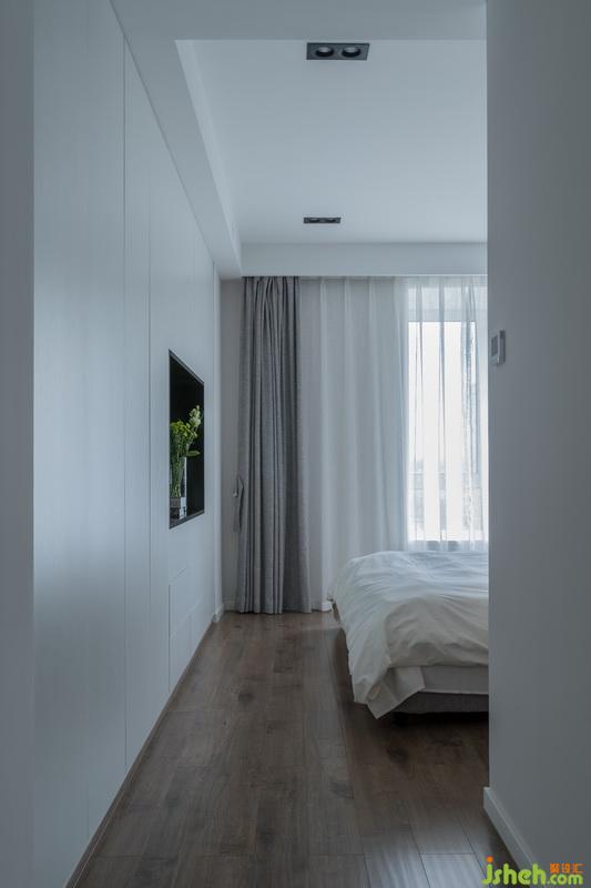 主臥無論是色彩還是材質(zhì)都延續(xù)了整體低調(diào)且質(zhì)感的風(fēng)格,電視背景墻區(qū)域做了一整排的儲(chǔ)物柜,保證了足夠的儲(chǔ)物空間,搭配深色的木地板,營造舒適的休息空間。