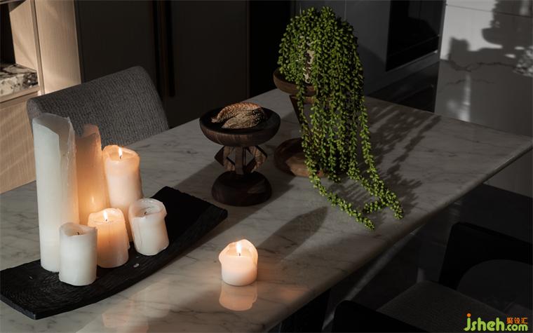 大理石背景墻以其自然獨特的紋理襯托著空間的高雅格調(diào),濃淡相宜的一支綠、一抹黃、抽象藝術(shù)掛畫、淡雅瓷器等使得空間格調(diào)更圓滿,仿佛這是東方文人雅士的愜意居所。在此空間,設(shè)計師以獨特、松弛有度的手法使得空間在東方雅與現(xiàn)代的交融下,濃厚的藝術(shù)文化底蘊在此空間舒展、蔓延,這是一個精神與美學(xué)并驅(qū)的空間。