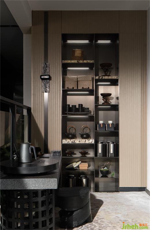 在多功能房的設(shè)計,設(shè)計師塑造“大隱于市,大巧若拙 ” 雅逸的空間。斑駁綠植、石玩、器物,藝術(shù)裝飾畫,書籍等在空間內(nèi)有序組合排序,東方美學(xué)元素與當代空間藝術(shù)的融合,曾隱匿于歷史中的風雅穿越時間與空間的界限,重現(xiàn)綻放于當下。