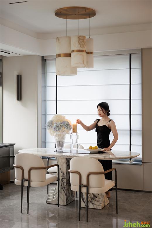 餐桌采用了斯卡帕的設(shè)計(jì)手法,層層疊疊的精細(xì)打磨,樣板間設(shè)計(jì)幾何形狀與天然石材融為一體彰顯家的細(xì)致品味,古典而極具現(xiàn)代感。
