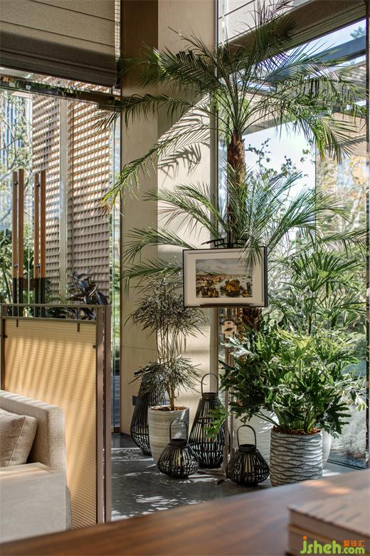 售樓處設(shè)計(jì)空間的角落打造椰林般的熱帶氛圍,飽滿(mǎn)的深綠色中感受夏日的一片清涼,散發(fā)著源源不斷的生命力。