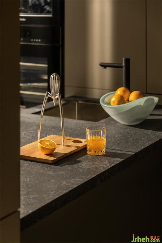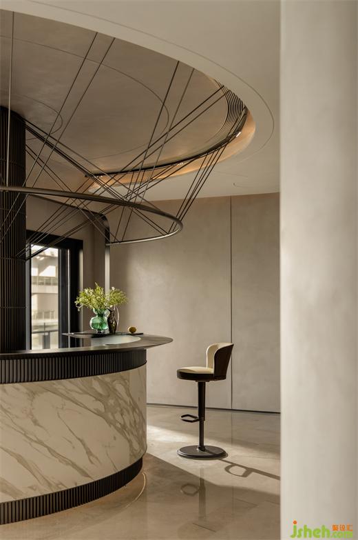 設(shè)計(jì)師從船艇桅桿得到靈感,化作吧臺(tái)的線條,筆直有力的金屬搭配白色大理石紋,簡(jiǎn)單的手法達(dá)到四兩撥千斤的效果,溫潤(rùn)奢雅而纖塵不染。