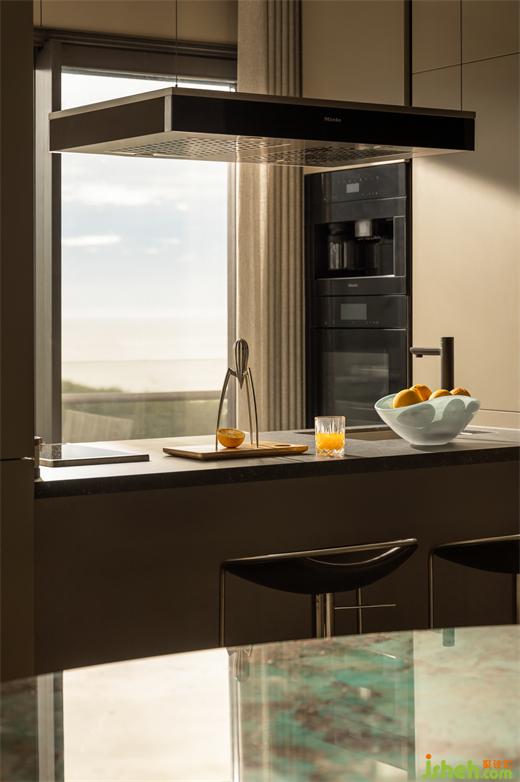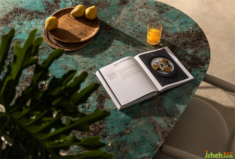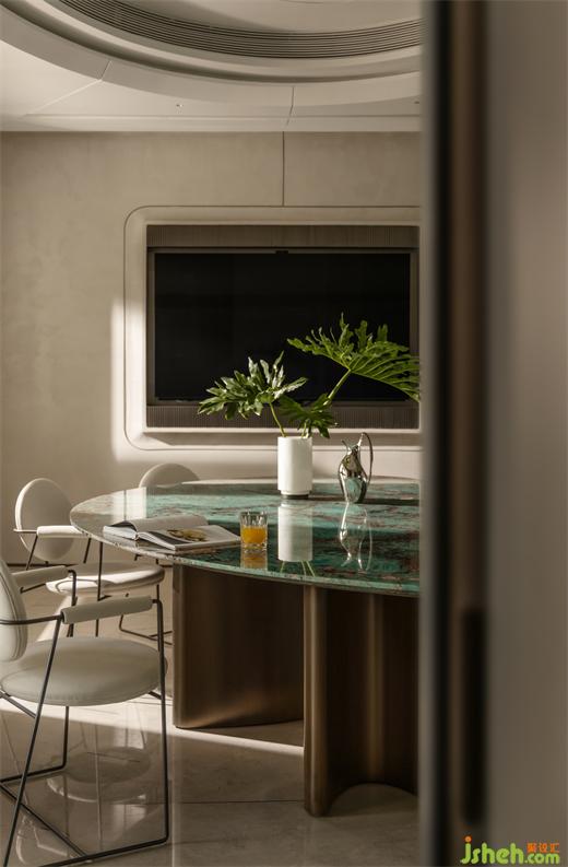三亞私宅設(shè)計(jì)將餐廳布局在南面,搭配亞馬遜綠石打造3.2×1.5米長(zhǎng)的餐桌,海藍(lán)色調(diào)的石材呼應(yīng)山海的翡翠光輝,讓每一次相聚都是欣喜的際遇。